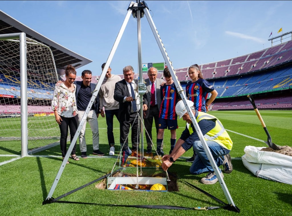 El pasado 29 de mayo se realizó el acto colocación de la primera piedra de inicio de las obras del nuevo Spotify Camp Nou y el entierro simbólico en el césped de la ‘caja de los recuerdos’ en el césped del Estadio. De esta forma, se simboliza el inicio de unas obras que culminarán en el año 2026 con la inauguración del futuro nuevo Estadio, epicentro del proyecto del Espai Barça.